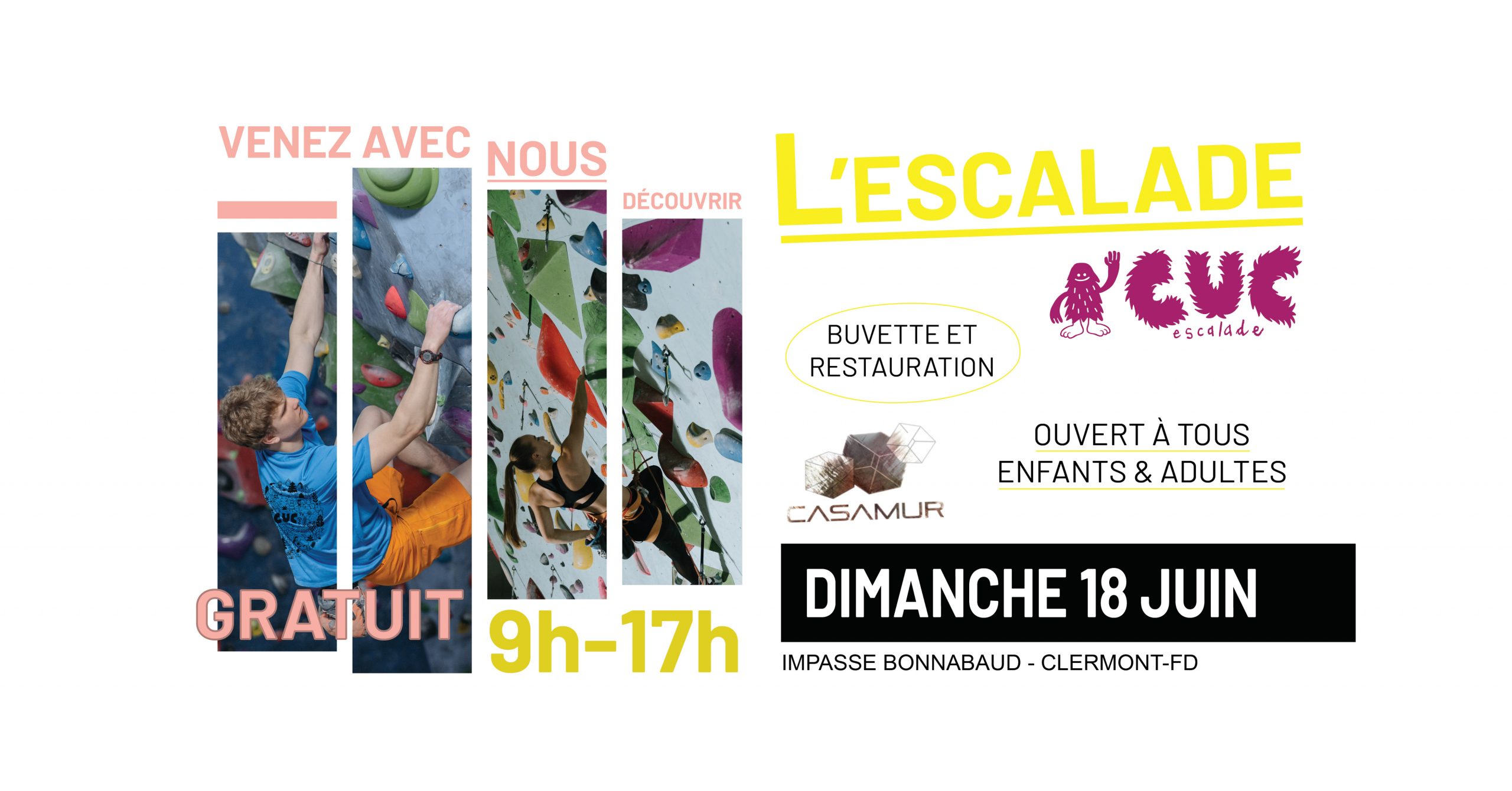 Venez avec nous découvrir l’escalade et le Club CUC Escalade, à Casamur, Impasse Bonnabaud, dans le centre de Clermont-Ferrand, de 9h à 17h.